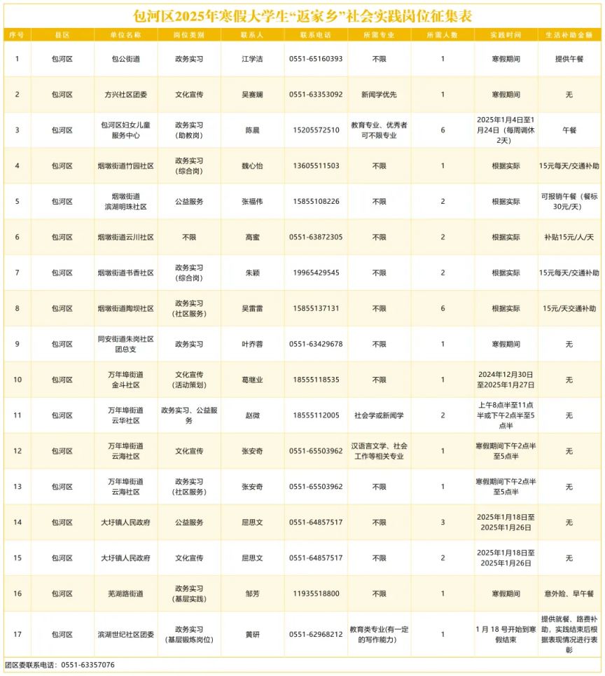 关于2025年合肥包河区寒假大学生返家乡社会实践报名资格的详解,以下是一般性的说明,具体要求可能因年份和当地政策的变化而有所不同。以下信息仅供参考: